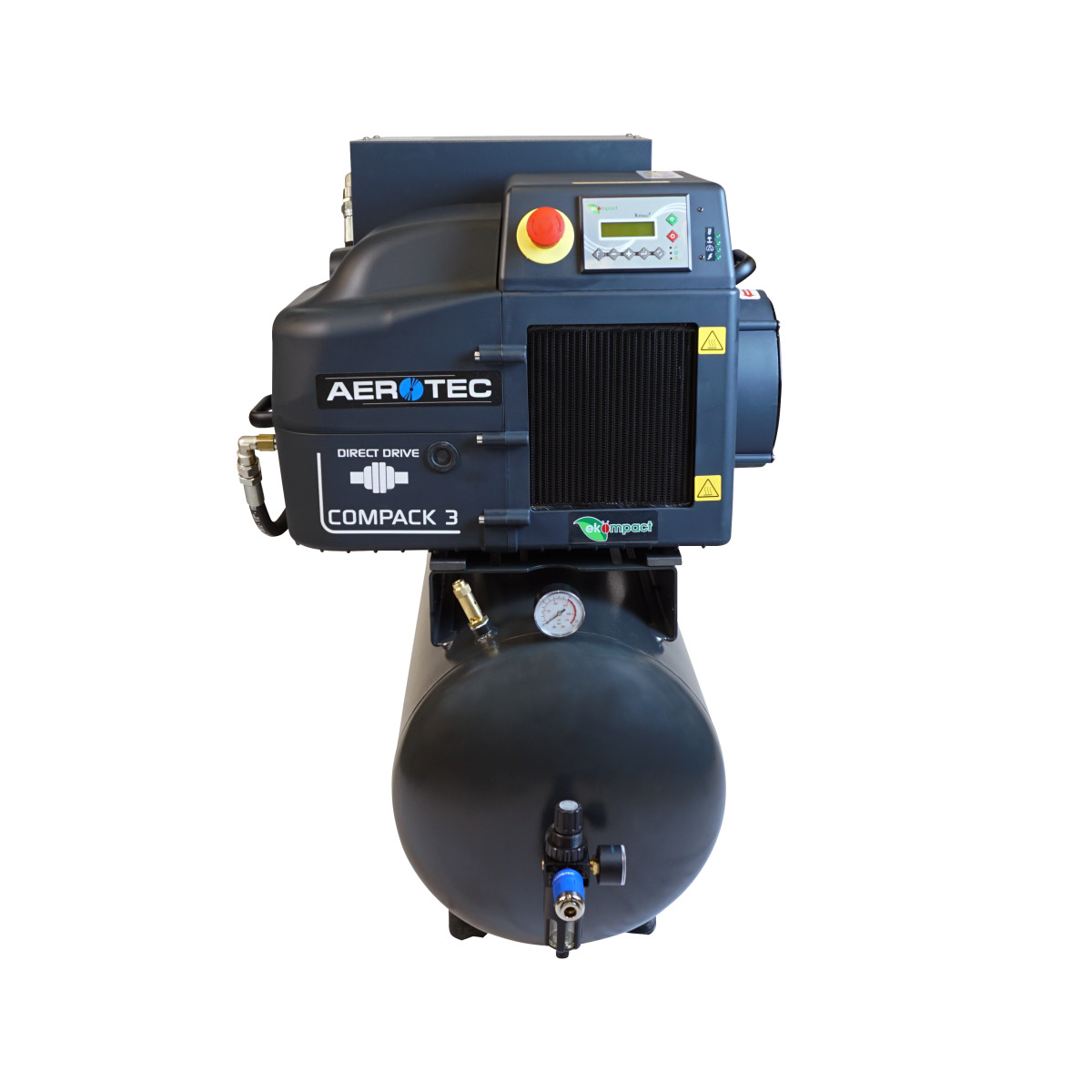 Bei unserer Aerotec COMPACK SMART 2 TR-90L PRO handelt es sich um eine komplette Kompressoranlage für den 24 Stunden Betrieb ohne Schallschutzkabine. Mit ihrer hochmodernen Mikroprozessorsteuerung können diese Anlagen in ihren Parametern programmiert und permanent systematisch erfasst werden. Die Steuerung ermöglicht einen automatischen Wiederanlauf nach einem Stromausfall und zeigt die wichtigsten Wartungsparameter im Display an. Weiterhin verfügt die Steuerung über die Möglichkeit der Aktivierung REMOTE sowie Fern-Ein-Aus. Somit haben Sie Ihre Druckluftanlage immer im Blick – egal, wo Sie sich aufhalten. Dadurch, dass diese Anlage auf Gummipuffern gelagert ist, ist diese zudem absolut Vibrationsfrei.